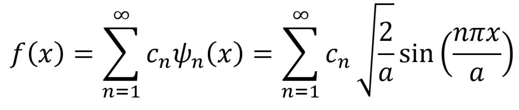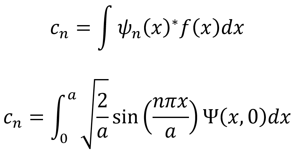 The first equation below can be employed to compute the nth coefficient cn. Here, f(x) = Ψ(x,0) which is an initial wave function. Note that the initial wave function can be any function Ψ(x,0) and the result will generate coefficients for that starting point. This first equation is derived using the orthonormality of the solution set. Note that the formula applies to most quantum mechanical systems since the properties of orthonormality and completeness hold for most quantum mechanical systems (though there are some exceptions). The second equation below computes the cn coefficients specifically for the infinite square well system.