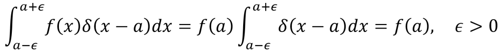 Recall that the Dirac delta function δ(x) is an infinitely high and infinitely narrow spike at the origin with an area equal to 1 (the area is obtained by integrating). The spike appears at the point a along the x axis when δ(x – a) is used. One important property of the Dirac delta function is that f(x)δ(x – a) = f(a)δ(x – a). By integrating both sides of the equation of this property, one can obtain the following useful expression. Note that a ± ϵ is used as the bounds since any positive value ϵ will then allow the bounds to encompass the Dirac delta function spike.