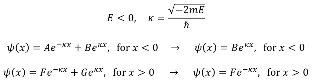 For the bound states where E < 0, the general solutions are given by equations below. The substitution κ is defined by the first equation below, the second equation below is the general solution for x < 0, and the third equation below is the general solution for x > 0. (Since E is assumed to have a negative value, κ is real and positive). Note that V(x) = 0 for x < 0 and x > 0. In the solution for x < 0, the Ae–κx term explodes as x → –∞, so A must equal zero. In the solution for x > 0, the Feκx term explodes as x → ∞, so F must equal zero.