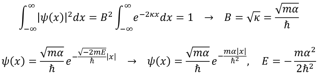 As seen above, the delta-function well only exhibits a single bound state energy E. By normalizing the wave function ψ(x) = Be–κ|x|, the constant B is found (as seen in the first equation below). The second equation below describes the single bound state wave function and reiterates the single bound state energy associated with this wave function.
