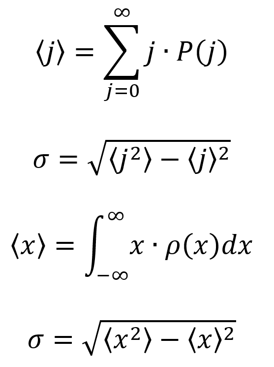 Equations for the expectation value and standard deviation are given as follows. The first equation computes the expectation value for a discrete variable j. Here, P(j) is the probability of measurement f(j) for a given j. The second equation is a convenient way to compute the standard deviation σ associated with the expectation value for j. The third equation computes the expectation value for a continuous function f(x). Here, ρ(x) is the probability density of x. When ρ(x) is integrated over an interval a to b, it gives the probability that measurement x will be found over that interval. The fourth equation the same as the second equation, but finds the standard deviation σ for the continuous variable x.