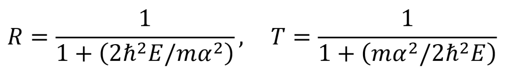 Also for the example case of particles fired from the left (moving to the right), by substituting back from β = mα/ћ2k and k = (2mE)0.5/ћ to get the expressions in terms of energy, the following equations are obtained for the reflection and transmission relative probabilities.