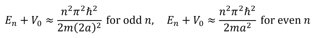 Remarkably, the above equation is the same as the one which describes the infinite square well’s energies. But realize that, for the finite square well, this only holds in the case of T = 1.