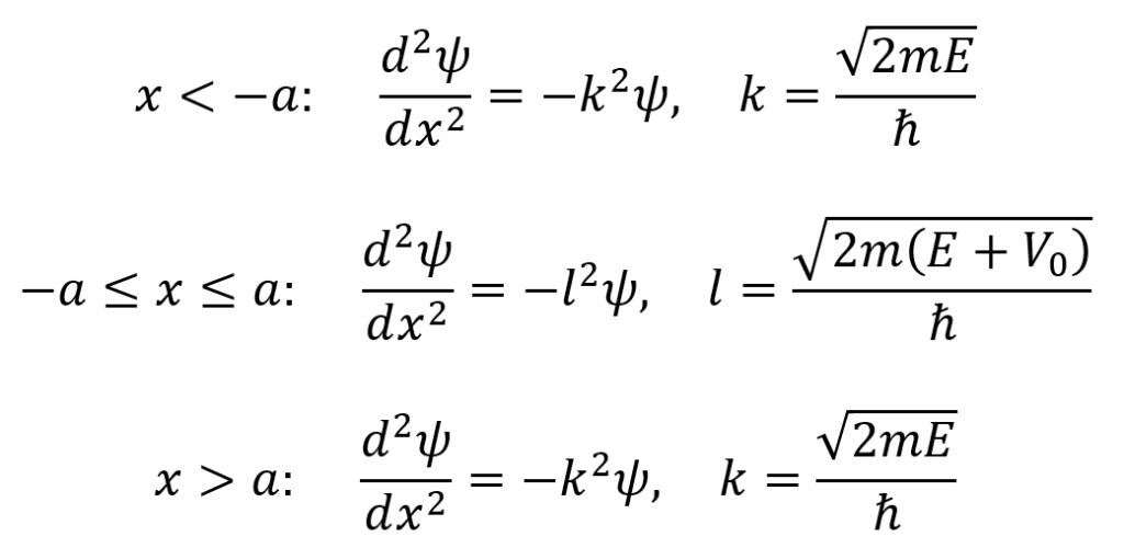 The finite square well is a system for which a particle’s V(x) = –V0 when –a ≤ x ≤ a and its V(x) = 0 otherwise. For this system, the Schrödinger equation is given as follows for the conditions x < –a, –a ≤ x ≤ a, and x > a. Note that the equations for x < –a and x > a are the same since V(x) = 0 in both cases (but the boundary conditions will differ as will be explained soon). As with the Delta-function potential well, the finite square well has both bound states (with E < 0) and scattering states (with E > 0). First, the bound states with E < 0 will be considered. In this case, the Schrödinger equations for the finite square well are as follows.