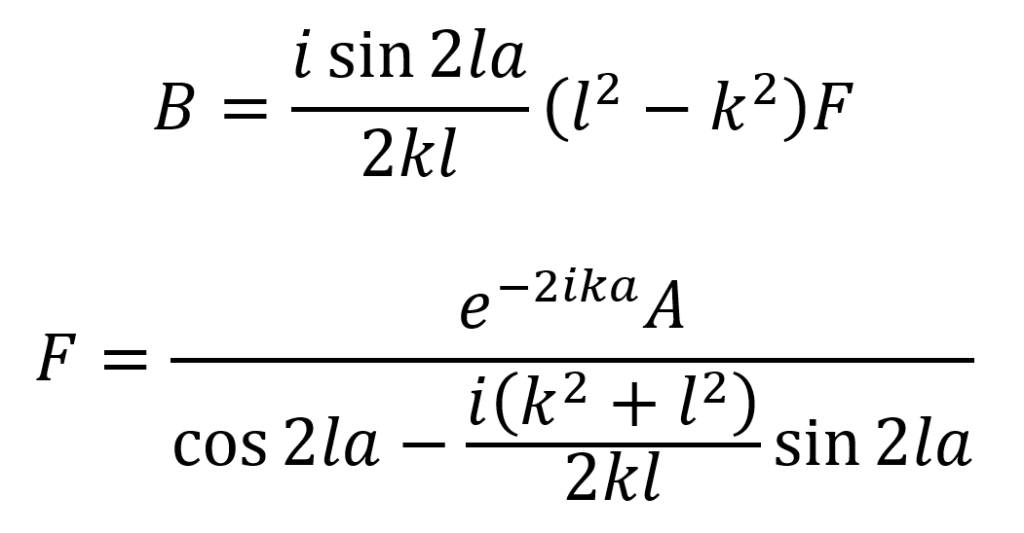 With the above equations, one can eliminate C and D and subsequently solve the system for B and F. This yields the equations below for B and F.
