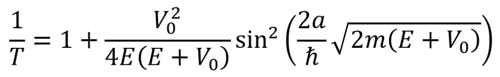 Since 1/T equals the equation below, whenever the sine squared term is zero, the probability of transmission T = 1.