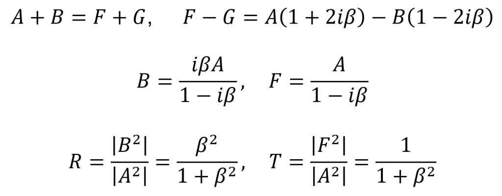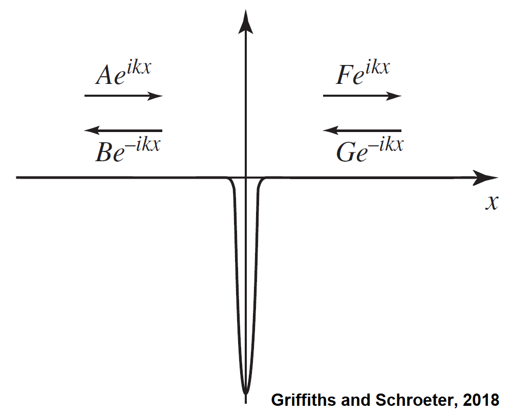 But recall that in a typical scattering experiment, particles are fired from one side of the delta-function potential, the left or the right. Here it will be assumed that the particles are fired from the left side of the well (moving towards the right). Note that similar calculations could be performed for the opposite case. With this assumption, one can realize that the coefficient A represents the incident (from the left) wave’s amplitude, the coefficient B represents the reflected wave’s amplitude, and the coefficient F represents the transmitted (to the right) wave’s amplitude. Finally, the coefficient G = 0 since there is not an incident wave from the right moving towards the left.