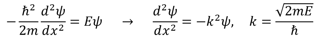 To start, the Schrödinger equation for the quantum free particle is given in the first equation below. Here, k = (2mE)0.5/ћ. Note that V(x) = 0 since there is no external potential acting on the particle. The second equation below is a general time-independent solution to the system in exponential form. The third equation below is the time-dependent solution to the system where the terms are multiplied by e–iEt/ћ. Realize that this general solution can be written as a single term by redefining k as ±(2mE)0.5/ћ. When k > 0, the solution is a wave propagating to the right. When k < 0, the solution is a wave propagating to the left.