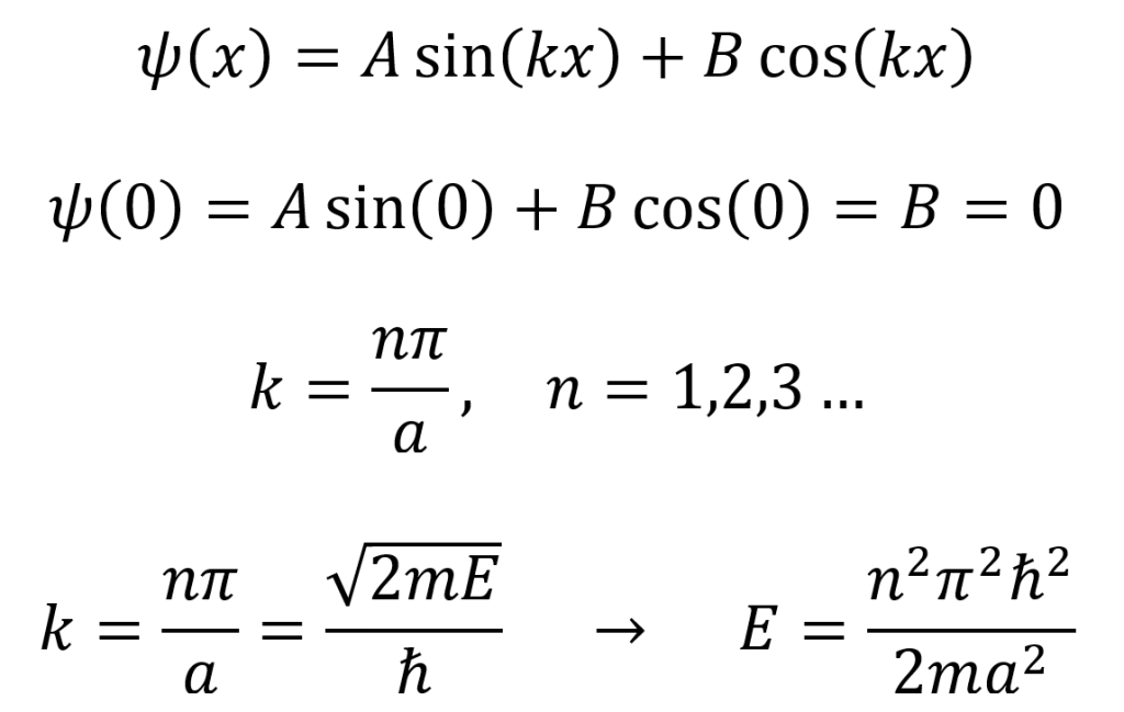 For the infinite square well, certain boundary conditions apply. In order for the wave function to be continuous, the wave function must equal zero once it reaches the walls, so ψ(0) = ψ(a) = 0. The general solution to the infinite square well differential equation is given as the first equation below. The boundary condition ψ(0) = 0 is employed in the second equation below. Since the coefficient B = 0, there are only sine solutions to the equation. Furthermore, if ψ(a) = 0, then Asin(ka) = 0. This means that k = nπ/a (where n = 1, 2, 3…) as given by the third equation below. The fourth equation below shows that this set of values for k leads to a set of possible discrete energy levels for the system
