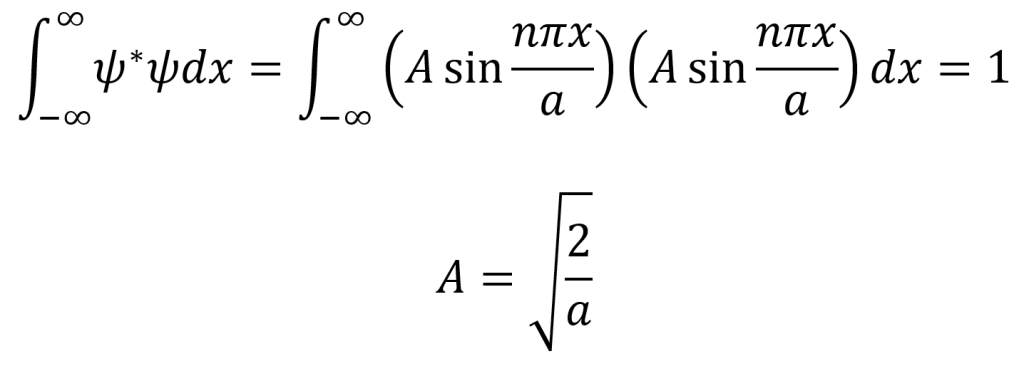 For a wave function to make physical sense, it needs to satisfy the constraint that its integral from –∞ to ∞ must equal 1. This reflects the probabilistic nature of quantum mechanics; the probability that a particle may be found anywhere in space must be 1. For this reason, one must usually find a (possibly complex) normalization constant A after finding the wave function solution to the Schrödinger equation. This is accomplished by solving the following integral for A. Here, Ψ* is the complex conjugate of the wave function without the normalization constant and Ψ is the wave function without the normalization constant.
