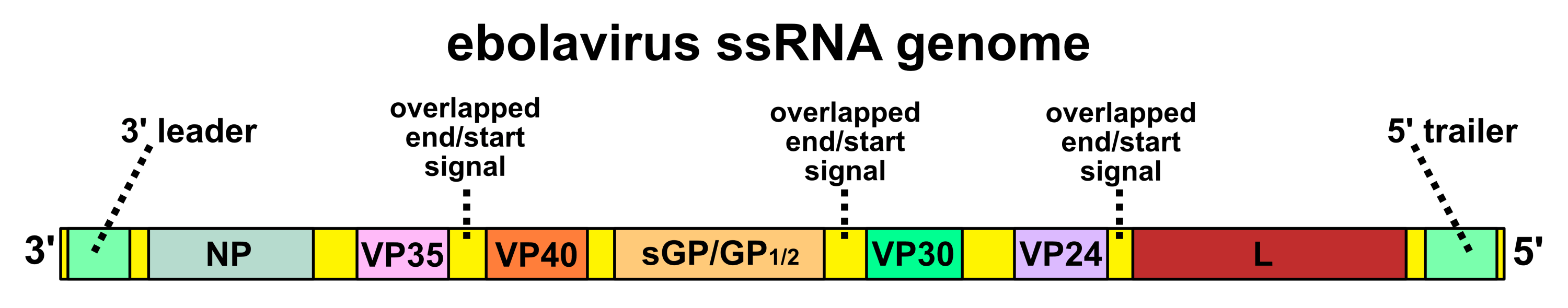 The ebolavirus genome consists of an 18.9 kb negative-sense single-stranded RNA (ssRNA) which encodes seven genes.1,2 Each gene is flanked by a 3’ and 5’ untranslated region (3’UTR and 5’UTR) which contain start and end signals. The start signals have the consensus sequence of 3’-CUNCUUCUAAUU-5’ and the end signals have the consensus sequence 3’-UAAUUC(U)5/6-5’. Since 3’UAAUU-5’ is found in both the start and end signals, they can overlap and (for most types of ebolavirus) do so at the junctions between the VP35-VP40, GP-VP30, and VP24-L genes. The rest of the genes have intergenic regions with non-overlapping start and end signals between them.