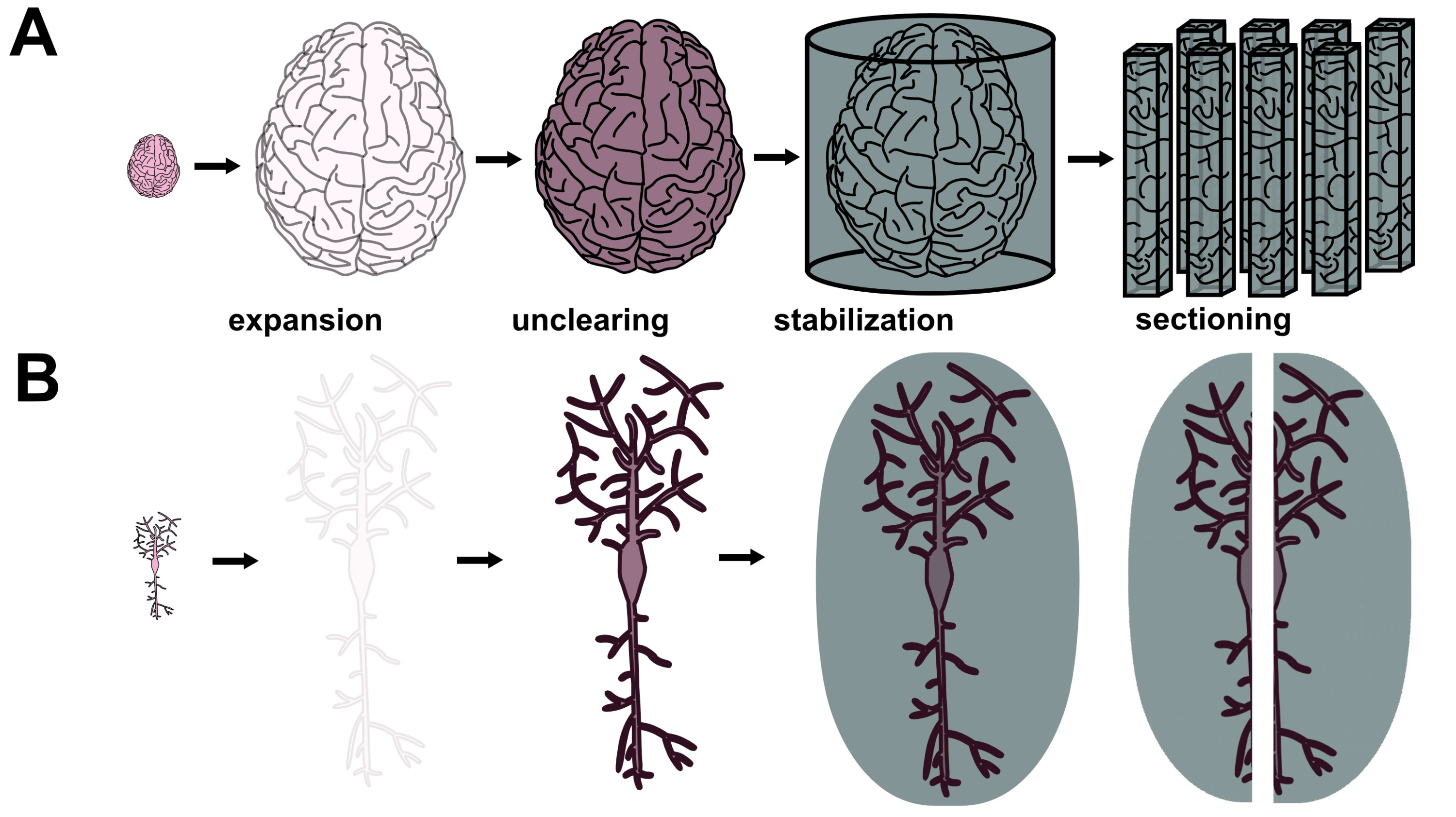 Figure 2 Proposed sample preparation technique for ExxRM. (A) Macroscale view of a human brain undergoing expansion, Unclearing, and stabilization. (B) Nanoscale view of a neuron within the brain undergoing expansion, Unclearing, and stabilization. Considerable amplification of signal density after Unclearing should occur.