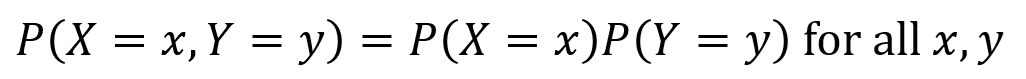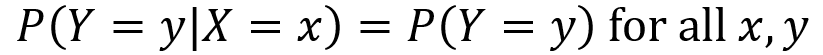 X and Y are furthermore independent if knowing the probability of one of them does not alter the probabilities of the other. Note the vertical line “|” denotes “given”, so P(X =x|Y=y) is probability that X=x given that Y=y.