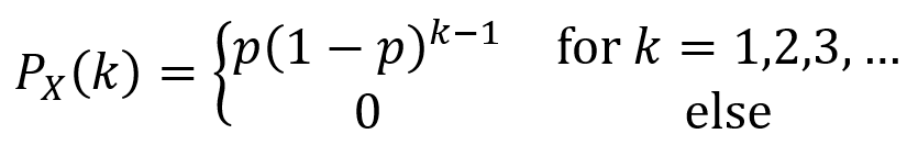 Geometric distribution: a random variable X is a geometric random variable with parameter p if its PMF is given by the equation below. The random experiment for this distribution consists of performing repeated independent “Bernoulli” trials until a given outcome (e.g. heads for a coin toss) occurs. The range of X is 1,2,3,… and describes the number of trials before the specified outcome. Here, 0 < p < 1. PX(k) tends to decline as k grows larger since it is more and more likely the specified outcome will have occurred with more trials.