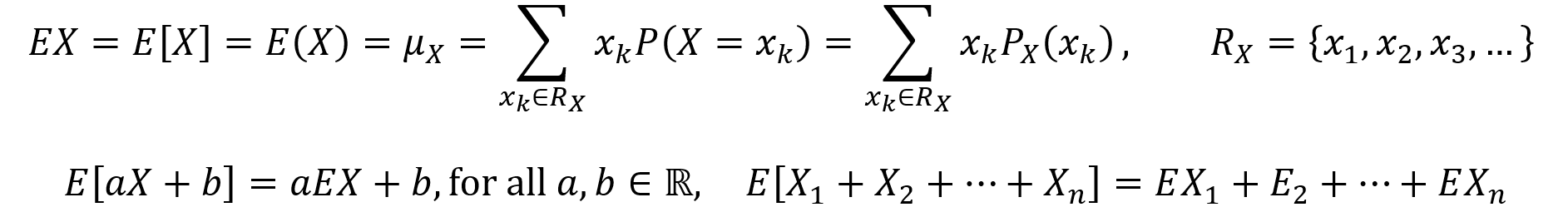 The expectation value E of a discrete random variable X is its average or mean, also described as a weighted average of the values in its range. The expectation value formula is given by the first equation below, along with various equivalent notational options. Here, the range RX of the random variable X can be finite or countably infinite. An important property of expectation is that it is linear. The linearity of expectation is described by the second equation below.