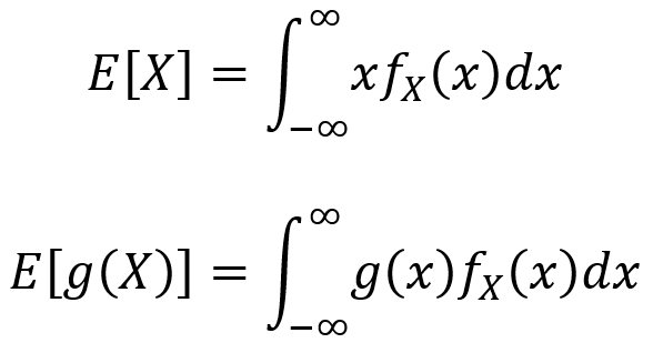 The expected value and LOTUS for continuous random variables are analogous to those in the discrete case, but with integrals instead of summations. For a continuous random variable X, the expectation value E[X] is given by the first equation below and the LOTUS is given by the second equation below.