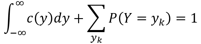 To obtain the PDF of a mixed random variable Y, one can integrate the continuous part and turn the discrete part into a sum as described by the following equation. Here, {y1,y2,y3,…} are a set of jump points of D(y). That is, they are the points for which P(Y = yk) > 0. With these mechanics, the PDF over negative infinity to infinity as well as over all jump points yk integrates and sums to 1, ensuring that the axioms of probability are satisfied.