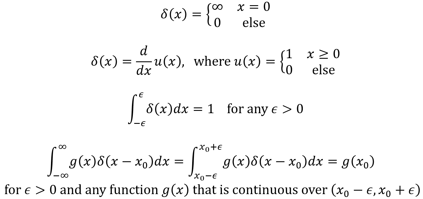 The Dirac delta function is not technically a function but a “generalized function” since it outputs an infinite value for x = 0. It is very useful since it can be used to define a PDF for discrete and mixed random variables. The Dirac Delta function δ(x) and its properties are given by the following equations. Note that u(x) is called the unit step function.