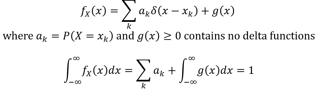 More broadly, the generalized PDF for a mixed random variable X is given by the first equation below. The second equation below describes how this generalized PDF satisfies the axioms of probability since its integral from negative infinity to infinity is 1.